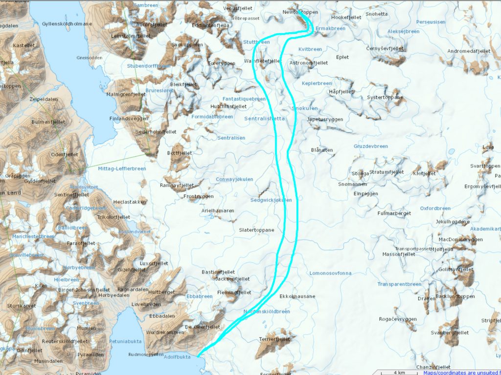 00. The approximate route of the ski expedition from Adolfbukta to Newtontoppen and back again. The entire ski should take 10-11 days.