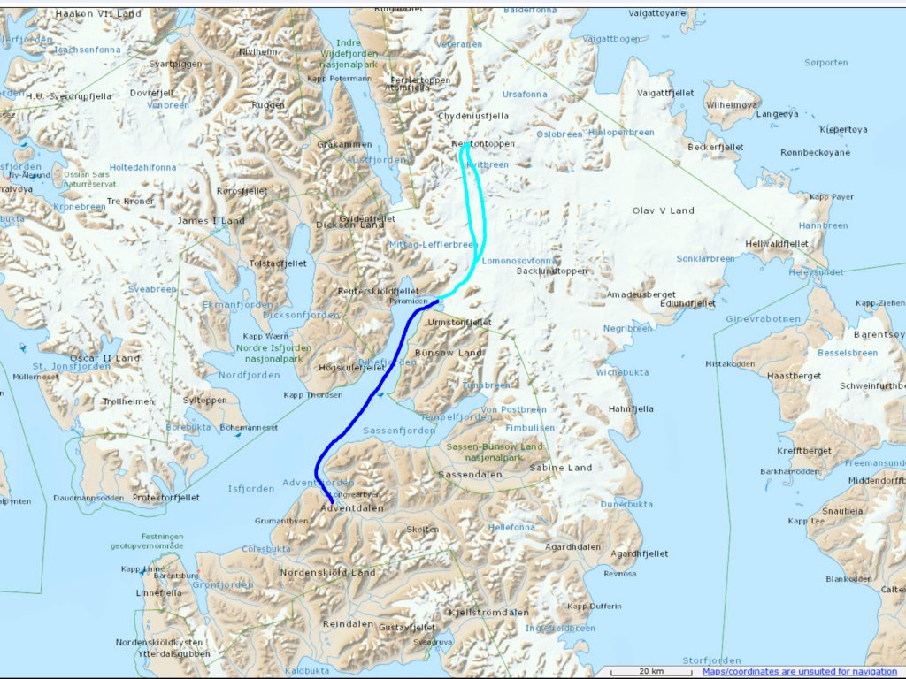00. The boat trip from Longyearbyen to Adolfbukta, in blue, is a day each way and then the ski from Adolfsbukta to Newtontoppen, in turquoise, is about 6 days and the route shown is approximate.