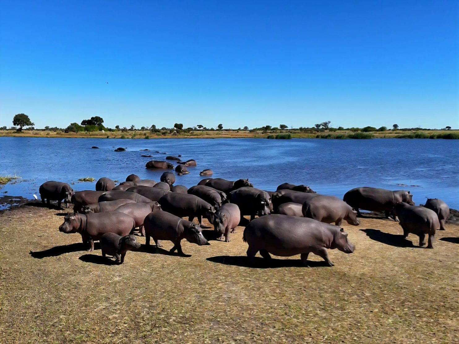 163. On the walk we passed another lagoons with a herd of hippopotamus out of the water basking in the sun.